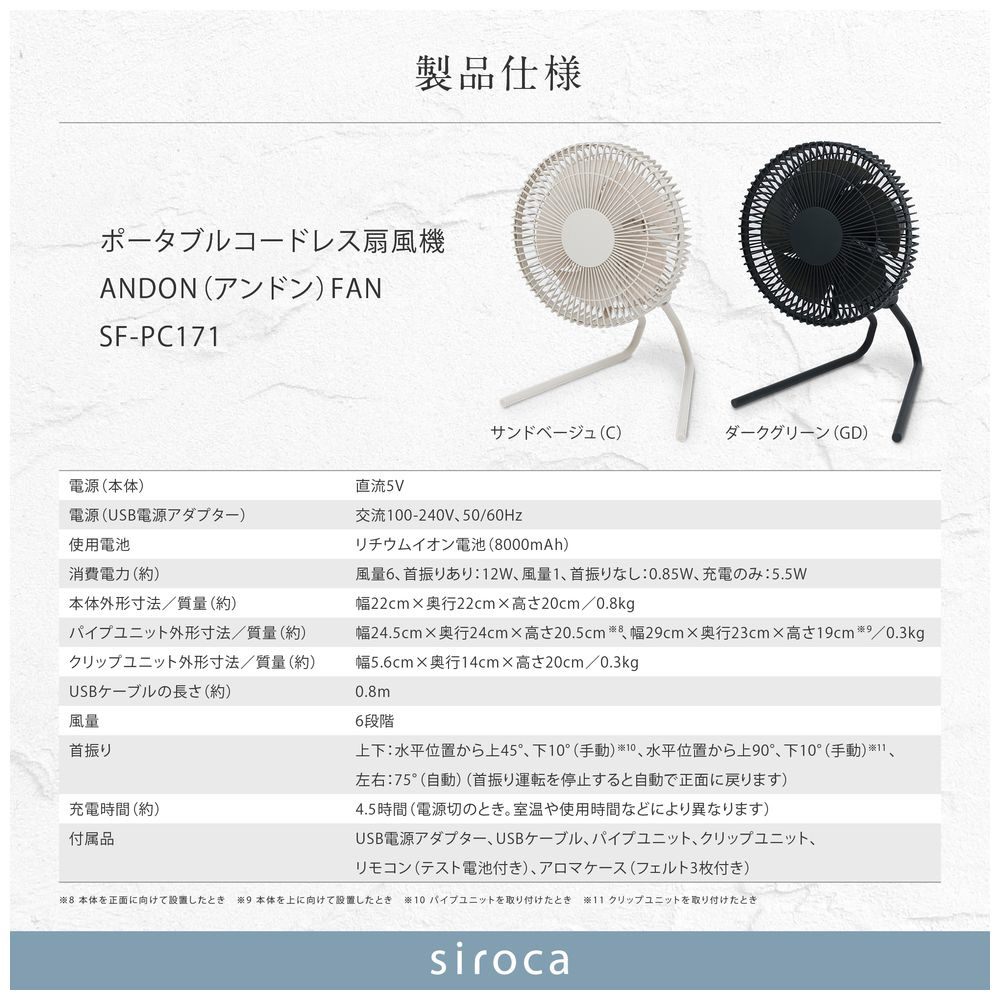 | 商品名 | ポータブルコードレス扇風機 ANDON FAN(アンドンファン) サンドベージュ SF-PC171C [DCモーター搭載 /リモコン付き] 【852】 |