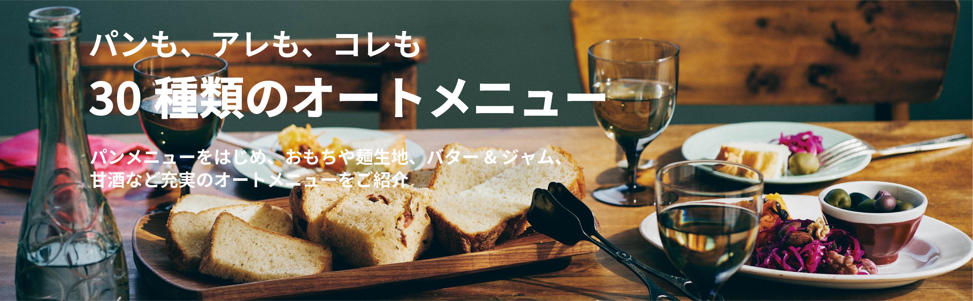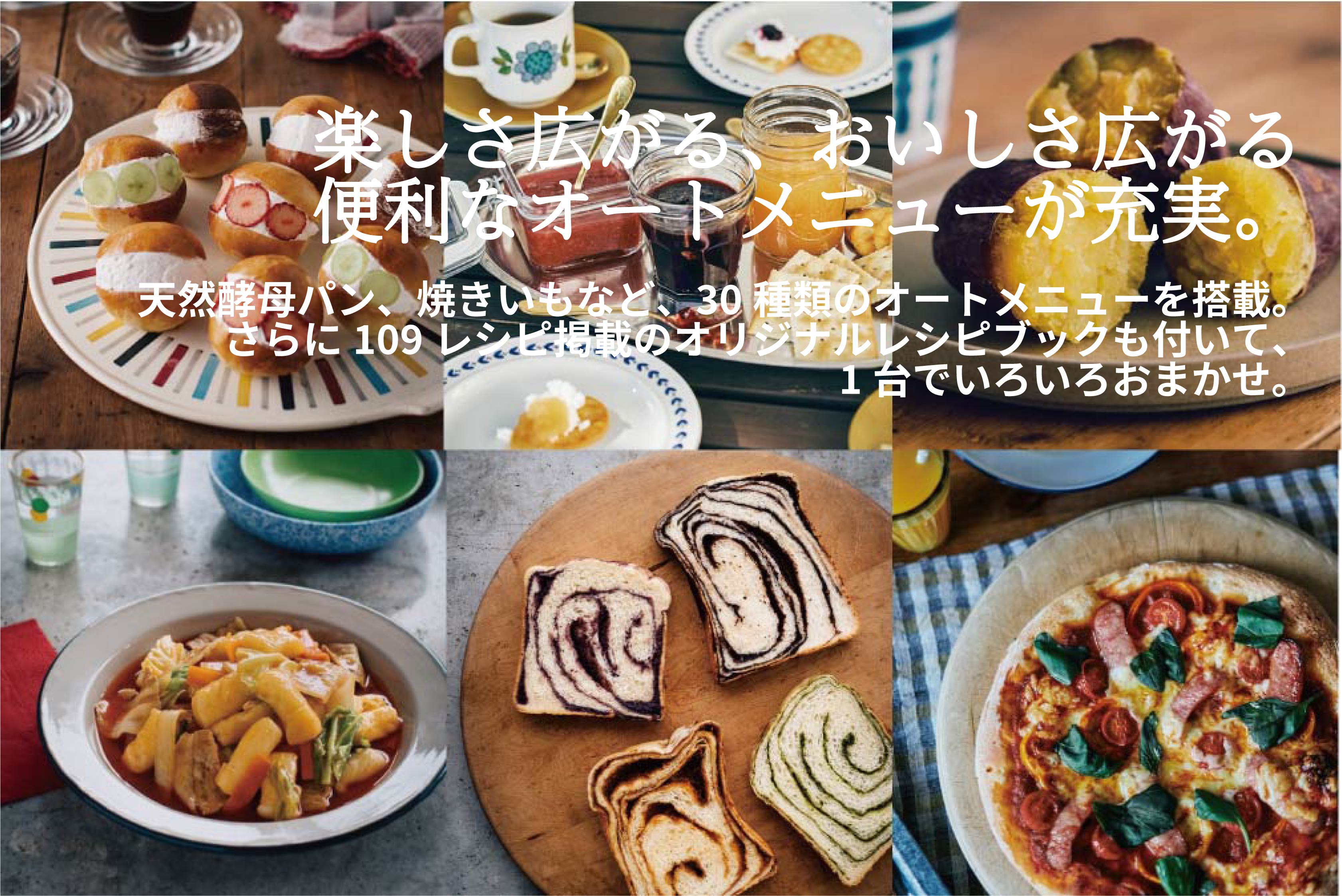 本製品は、パンメニュー以外にも、「もちつき」や「うどん・パスタ生地」、「フレッシュバター」や「フレッシュチーズ」などの乳製品、「焼きいも」など、30のオートメニューを搭載。また、付属のレシピブックには豊富な種類のパンからスイーツまで、109の多彩なレシピを掲載しています。