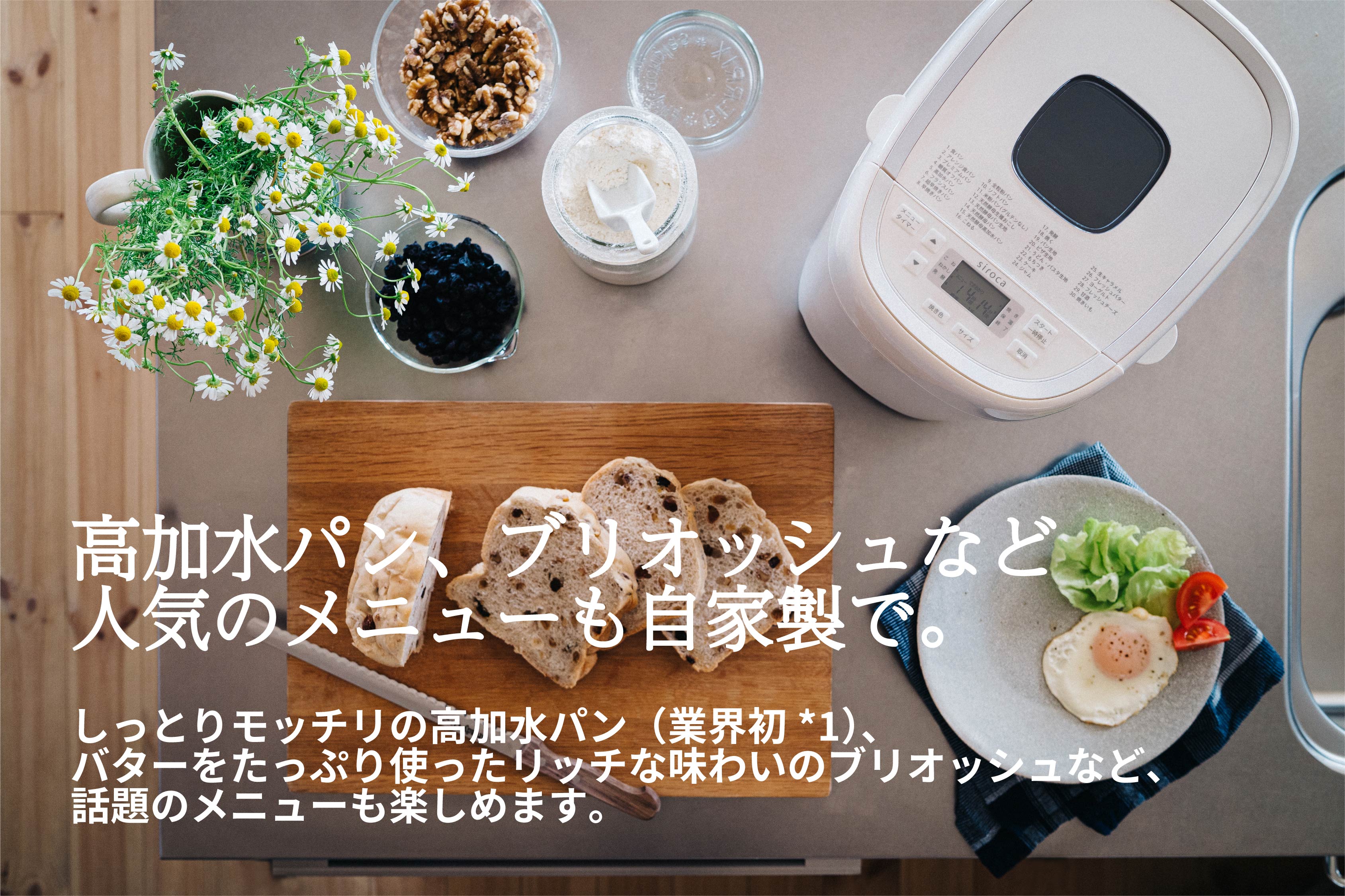 本製品は、業界初*2の高加水パンメニューを搭載しています。通常のパンの加水率が65%〜70%なのに対し、 加水率が80%以上の高加水パンは、しっとりもちもちとした食感に加え口当たりとのどごしの良さが特長で、 お子様からお年寄りまで年代を問わず食べやすいパンです。水分量が多いため生地がゆるく手ごねで作るには難しい高加水パンですが、 本製品では手軽に加水率90%*4の高加水パンを作ることができます。また、バターをたっぷり使用したリッチな味わいのブリオッシュなど、トレンドを意識した人気のパンも手作りでお楽しみいただけます。