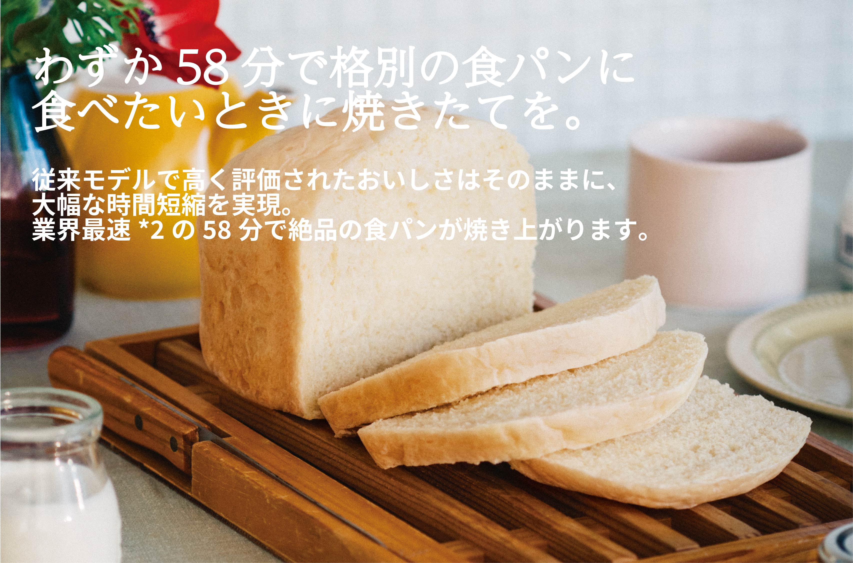 本製品は、業界最速*3のわずか58分で食パンが焼きあがる「超早焼きパン」メニューを搭載しています。 「パン作りは時間がかかる」というイメージのホームベーカリーをより身近に、毎日の生活の中でお使いいただきたいという想いから、 新たに搭載したメニューです。食べたいときにすぐに焼きたてのパンが作れるので、「時間がなく、なかなかホームベーカリーの出番がない」「調理時間の長さでパン作りを諦めていた」という方でも、 自宅で手軽にパン作りをお楽しみいただけます。