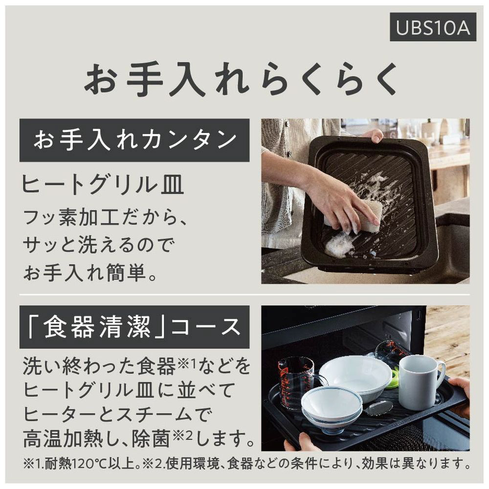 *2 試験機関:株式会社食環境衛生研究所、試験方法:食器に付着させた菌数を測定、除菌の方法:スチームオーブンレンジNE-UBS10Aを「食器清潔」で運転、対象:食器に付着した菌、試験結果:生菌減少率99.0%以上、試験番号:217465N