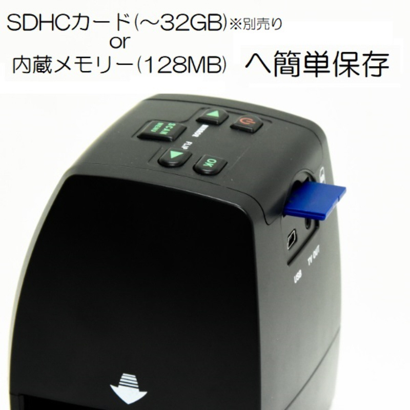 フィルムをSDHCカード、内蔵メモリ(128MB)へ簡単保存できるカラー液晶付きスキャナーです。フィルムをホルダーにセットして、スキャンボタン→OKボタンの1秒で保存。