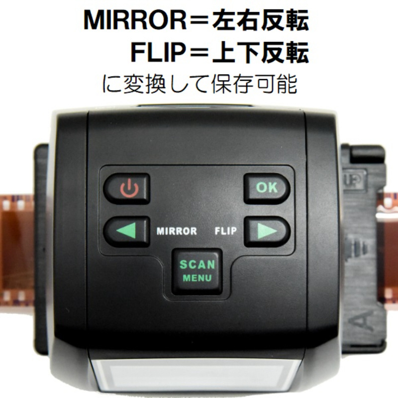 ネガフィルム/スライドフィルムの向きを間違えてセットしても、?/MIRRORもしくは?/FLIPボタンを押すことで、画像の左右・上下を反転して保存することができます。