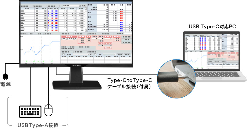 ■USB Type-Cケーブルで1本で映像入力と電源供給ができる、さらに2ポートのUSBハブ機能付き