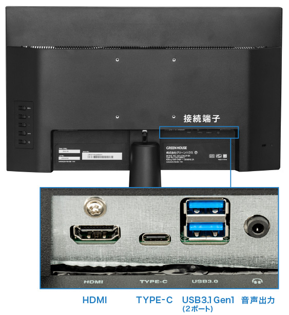 | 入出力端子 | [音声入出力端子] ステレオミニジャック(3.5mm)×1 [USBハブ機能] ポート数:2(ダウンストリーム)※Type-A データ転送速度: USB3.1 Gen1:最大5Gbps(理論値) USB2.0:最大480Mbps(理論値) USB1.1:最大12Mbps(理論値) 電源供給方法:セルフパワー※ディスプレイ電源より供給 供給電流:900mA以内 インターフェース:USB3.1 Gen1/USB2.0/USB1.1 |