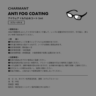 【メガネ くもり止めコート】成分:水、非イオン性界面活性剤、酒精(エチルアルコール) 液性:中性