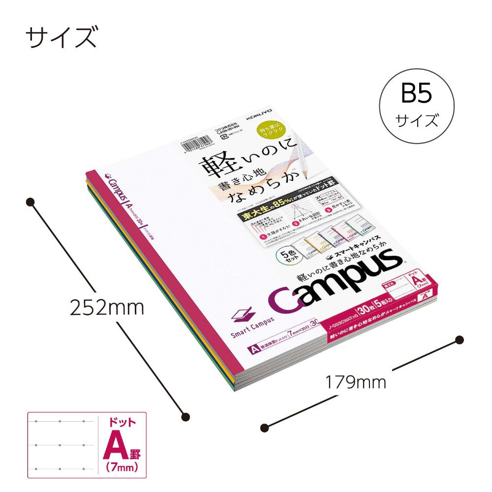 商品名 ノート Smart Campus(スマートキャンパス) 5色パック GS3CWATX5 [セミB5・B5 /7mm(A罫) /ドット入り罫線]