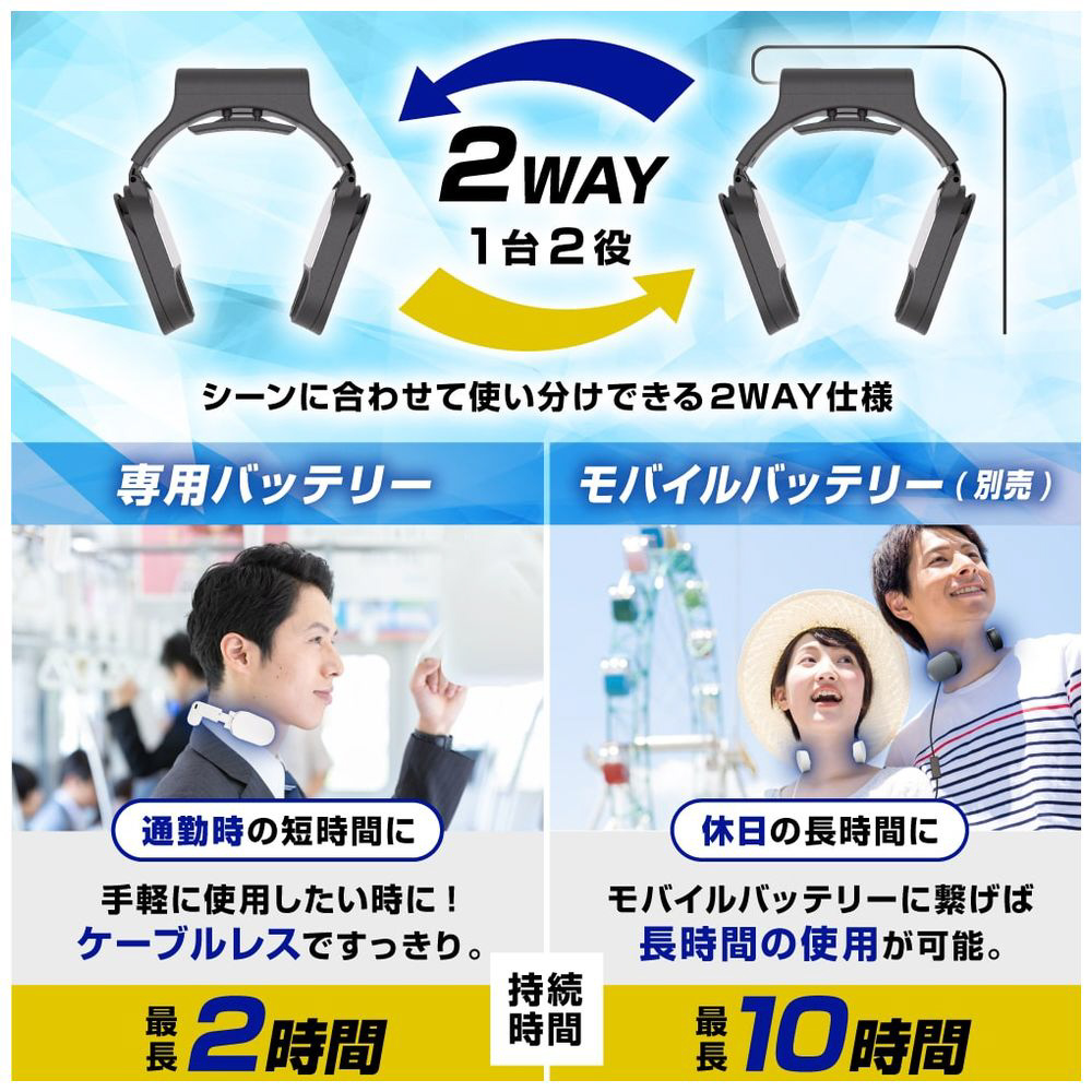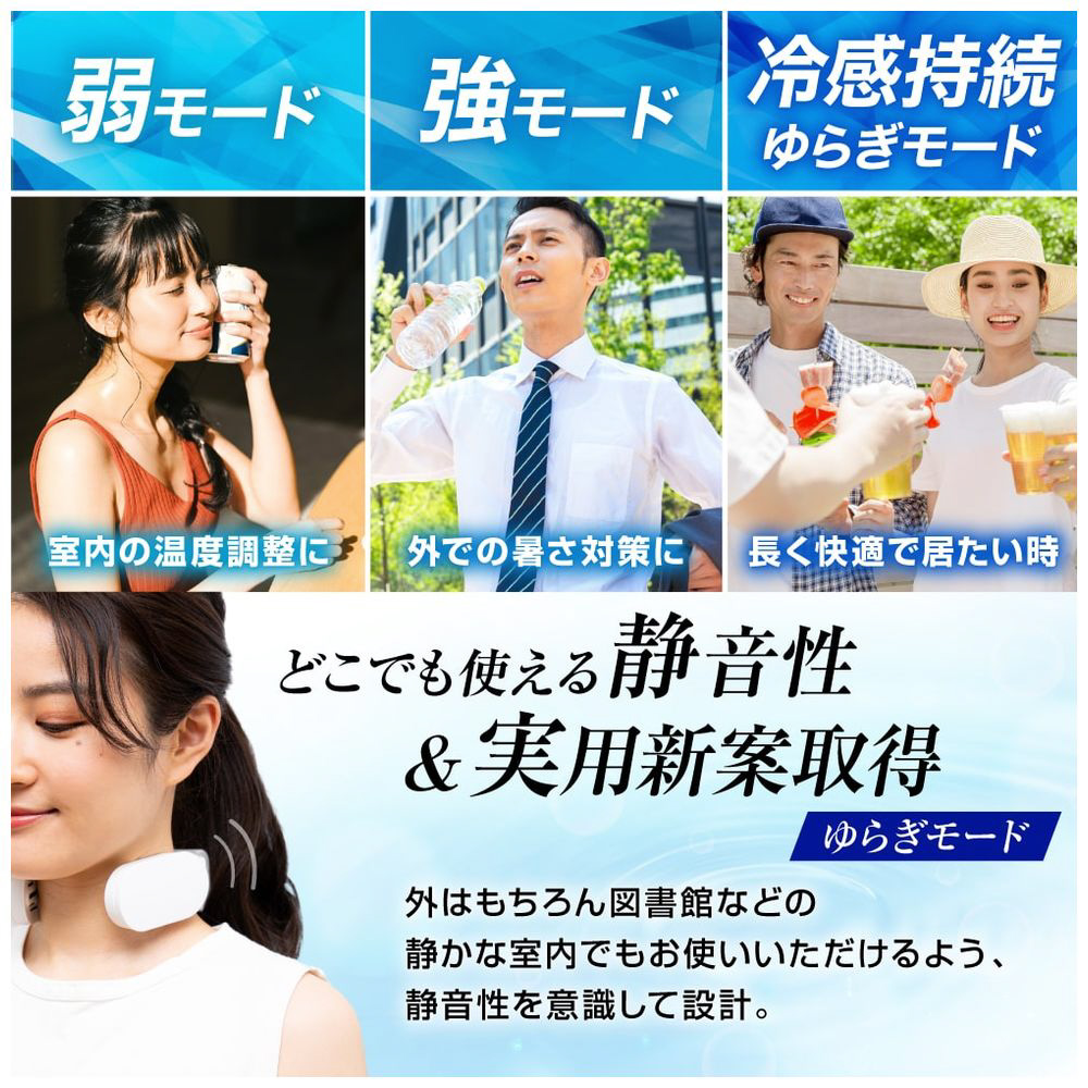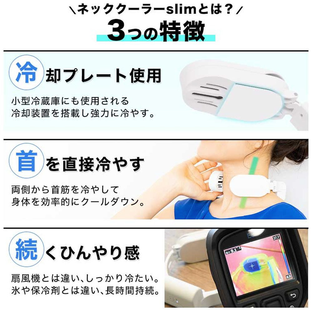 冷却プレートで首元を直接冷やして効率的にクールダウンNECK COOLE Siim。小型冷蔵庫にも使われるペルチェ冷却装置で真夏でもひんやり冷たい。付属の専用バッテリーで最長約120分使用可能。