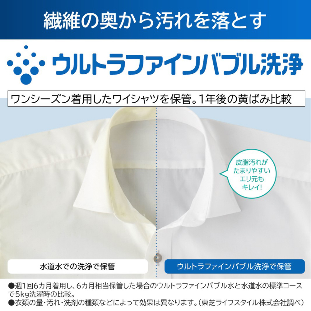 *1 独自の搭載技術により、洗濯機内部で1マイクロメートル未満のナノサイズの泡「ウルトラファインバブル」を生成し、ウルトラファインバブル水と洗剤を混ぜ合わせた洗濯水により洗濯を行うことで、皮脂汚れに対する洗浄効果を高め、衣類の黄ばみを抑えられる洗浄技術