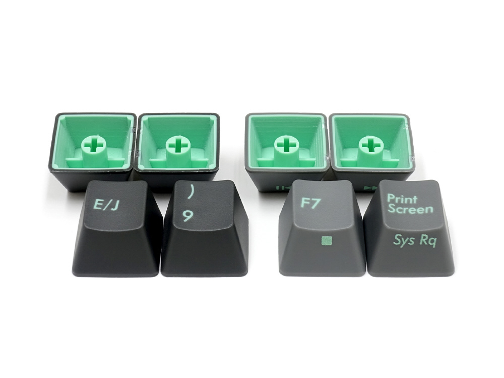 キーキャップのベースにはアスファルトとスカイグレーの2トーンを、印字部分には色鮮やかなチェレステを採用した特別仕様のキーキャップです。※キーキャップ及び印字部分は発光しません。
