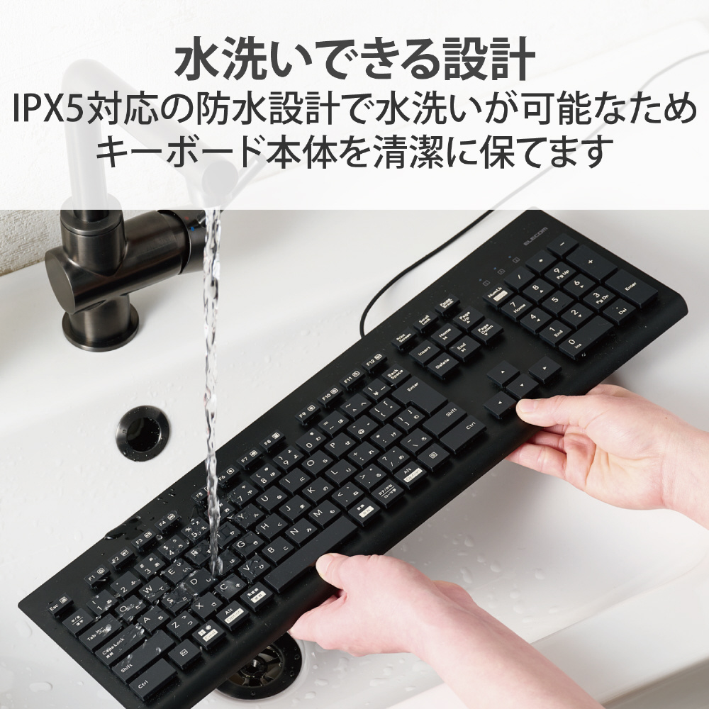 キーの隙間にたまったホコリを、丸洗いで簡単に除去可能。不意の水濡れでも安心の、防水タイプの有線キーボードです。