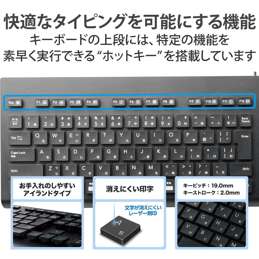 ・タイピングしやすいJIS規格準拠の標準日本語配列を採用しています。