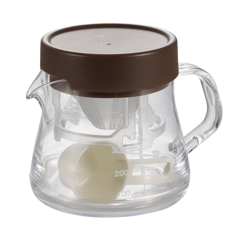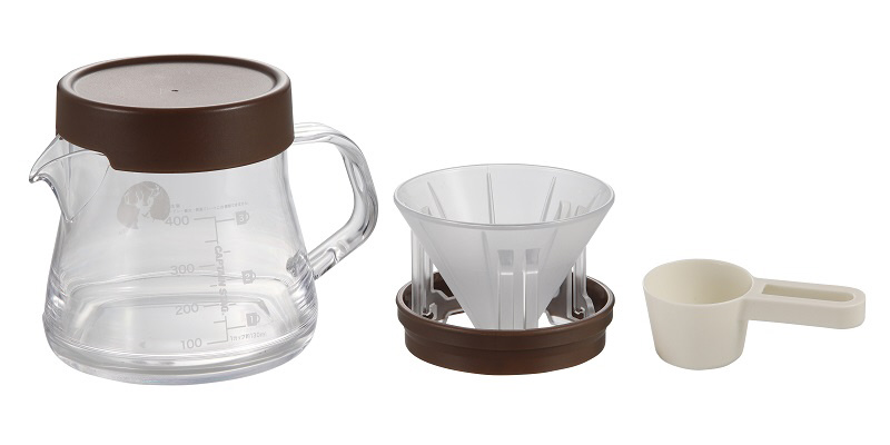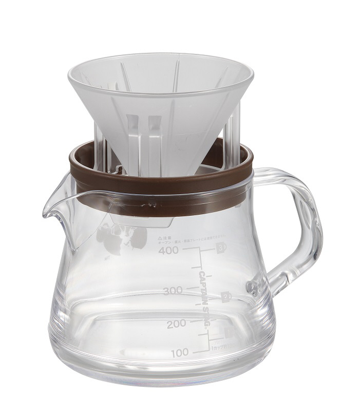 ドリッパーとセットになった割れないプラスチック製コーヒーサーバー。食洗機対応。本体にドリッパーを収納、持ち運びも便利。