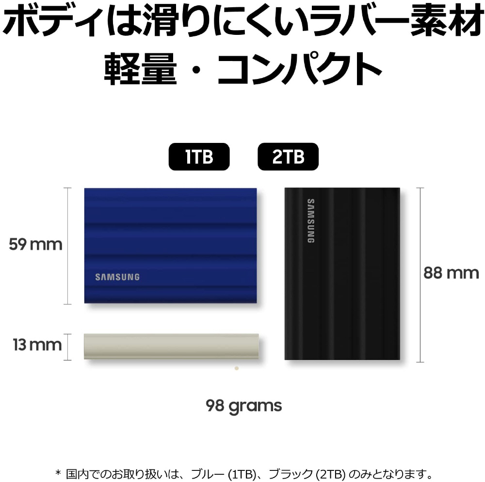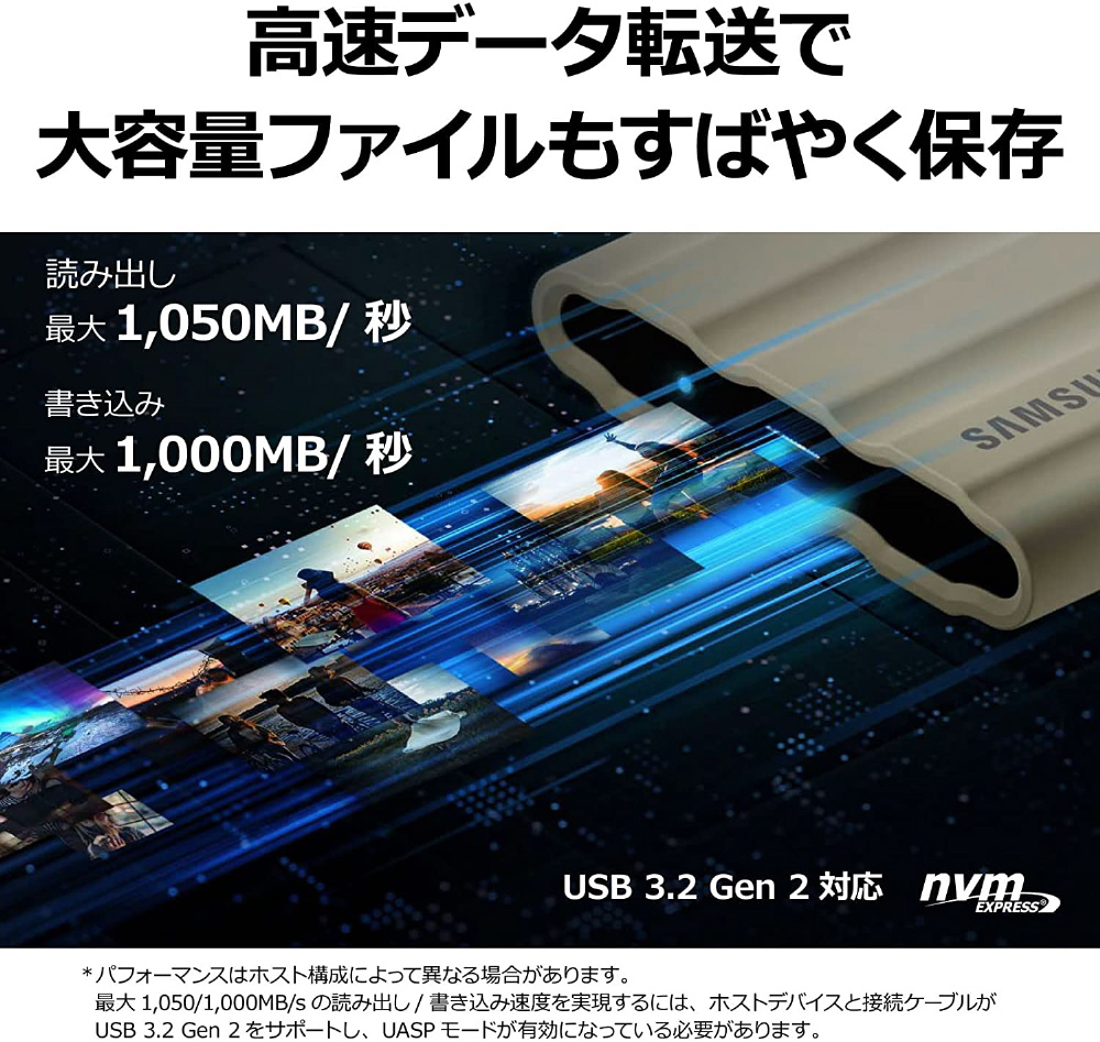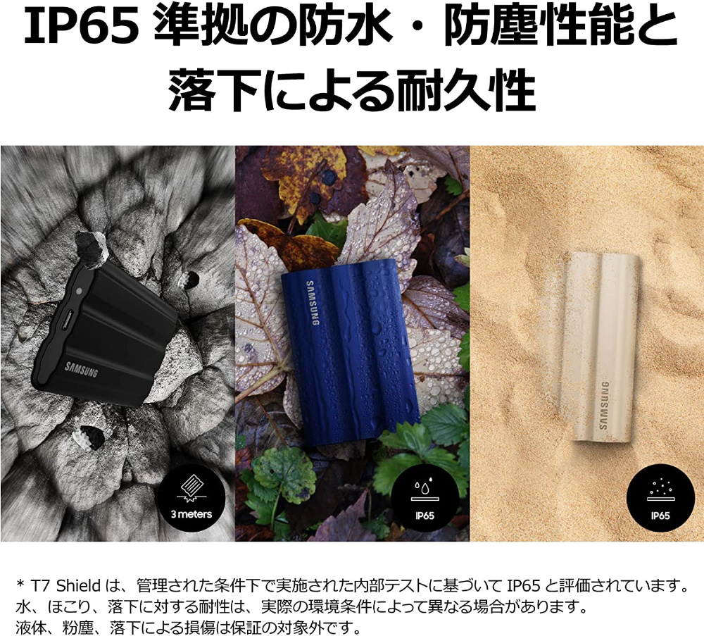 | 仕様2 | [保護性能] 防水性・防塵性:IP65準拠 耐落下性:最大 3m 耐衝撃性:非動作時 1500G、0.5ms期間、3軸 耐振動性:非動作時 10〜2000Hz、20G [セキュリティ] 暗号化:AES 256 ビット ハードウェア暗号化 ※パスワードによる保護(オプション) ソフトウェア:Samsung ポータブルSSDソフトウェア 1.0、Samsung Magician Software |