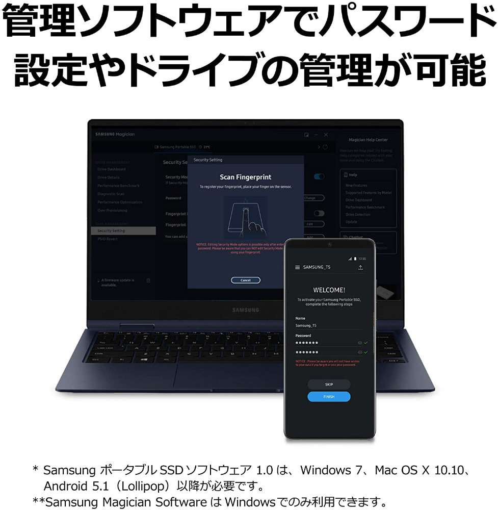 PC、Mac、Androidスマートフォン、タブレットでパスワードの設定などが可能なSamsungポータブルSSDソフトウェアで最新のファームウェアアップデートを入手してください。また、新たにSamsung Magician Softwareにも対応し、Windows PC上でドライブの状態を確認し、パフォーマンスを向上させ、データを保護することもできます。