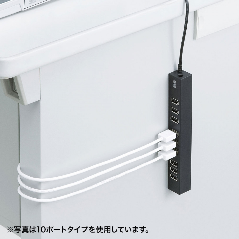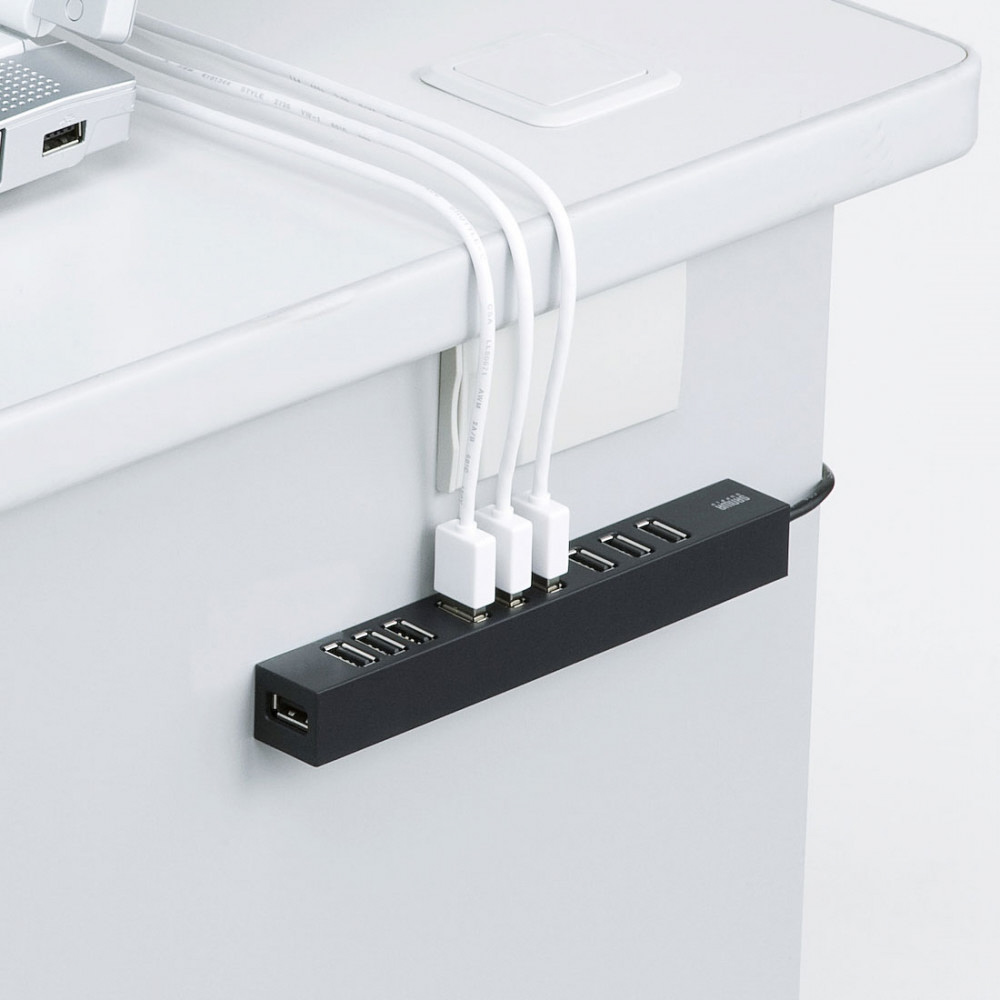 面ファスナーでどんな向きにでも固定でき、たくさんの機器が接続できる10ポートUSBハブ。