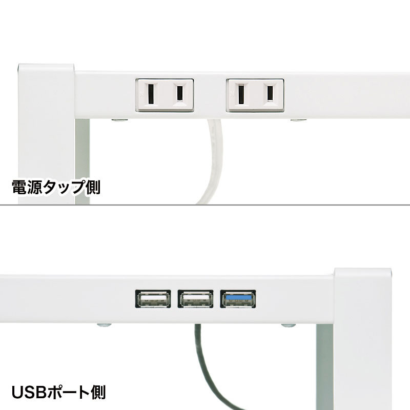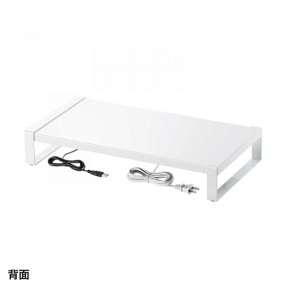 電源タップとUSBハブの付いた机上の空間を有効活用できる机上ラック。USB3.2 Gen1(USB3.1/3.0)×1ポート、USB2.0×2ポート。W500mm。