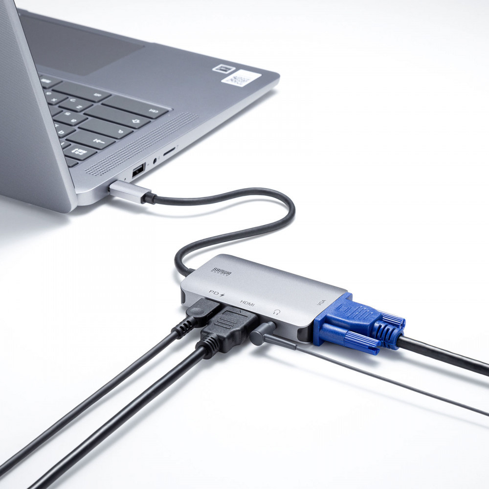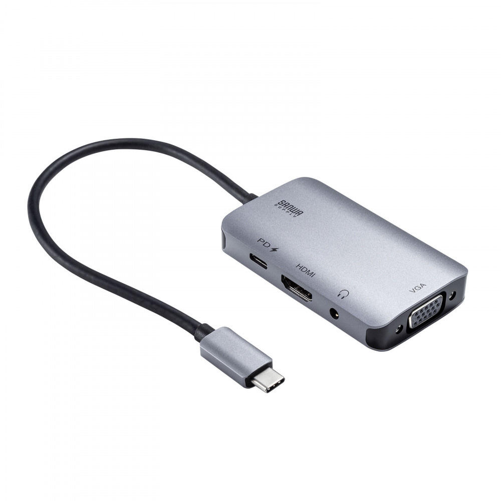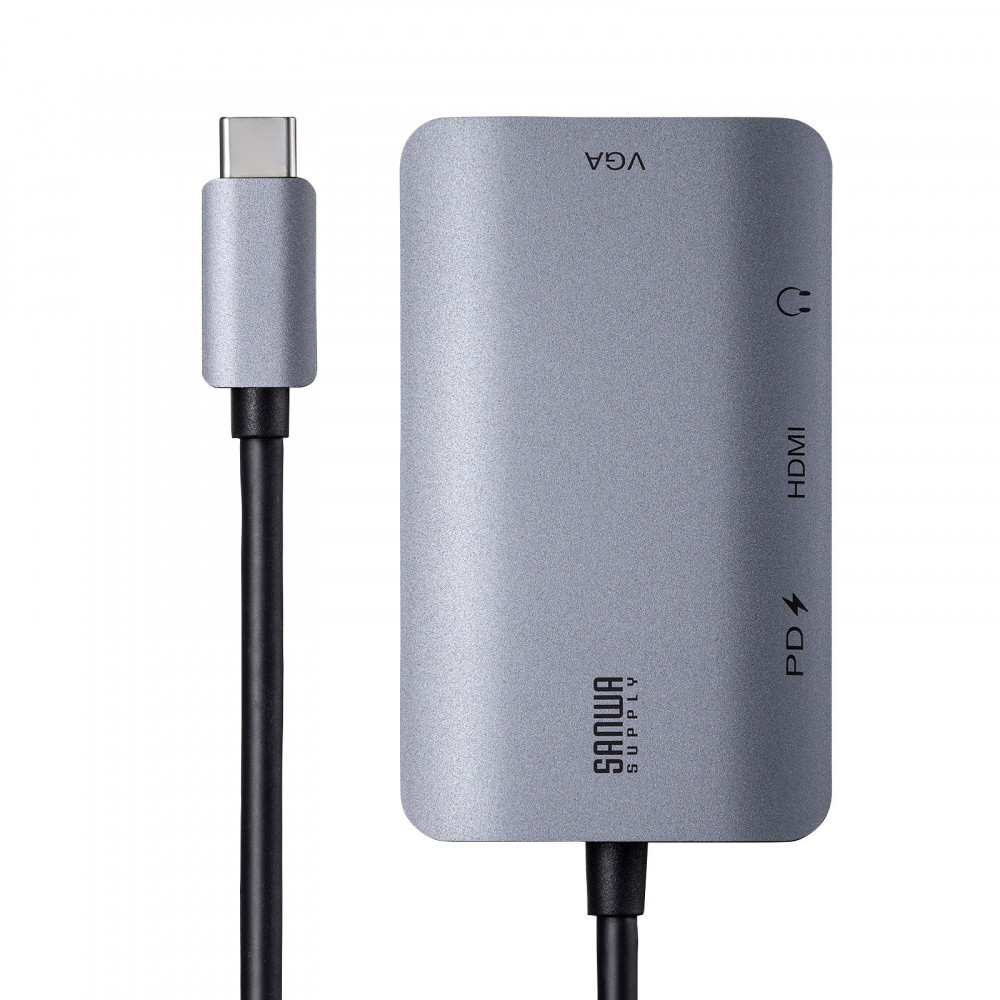 DisplayPort Altmodeに対応したType-CポートをHDMI(4K/30Hz)またはVGAに変換し映像出力ができる変換アダプタ。PD充電に対応しパソコンやタブレットを充電しながら映像出力可能。