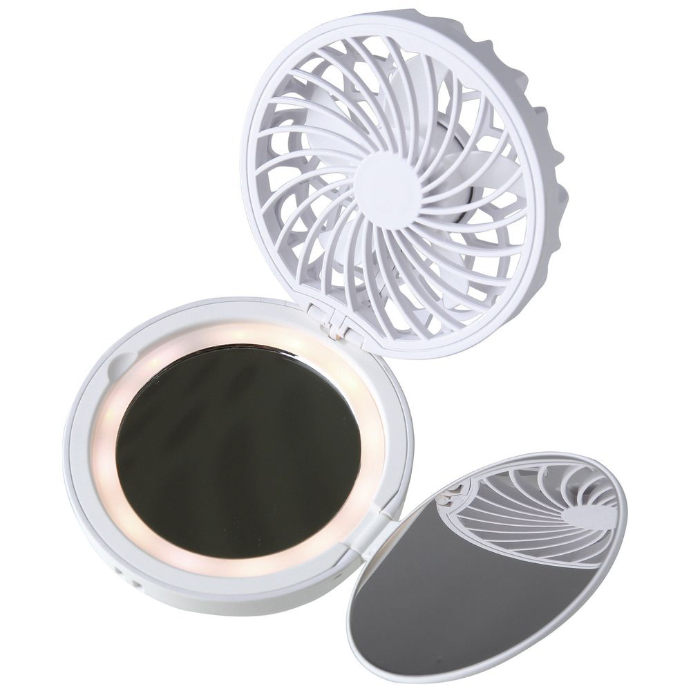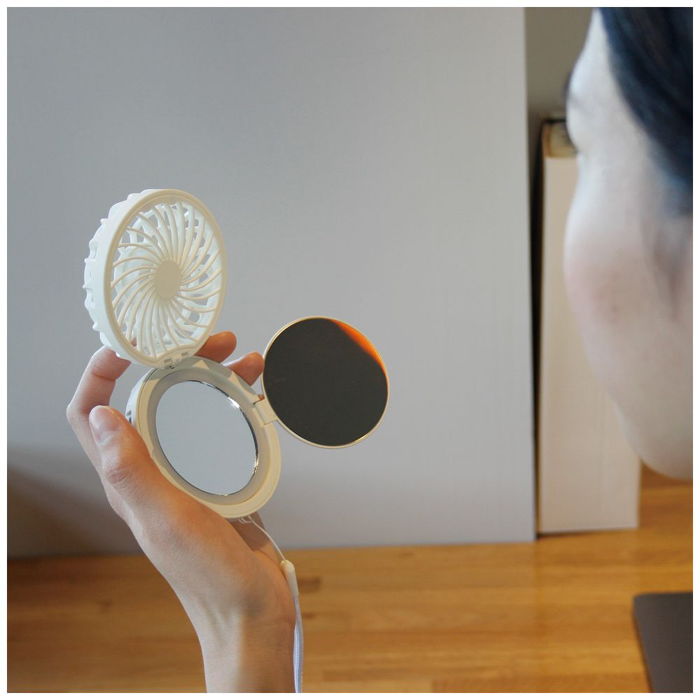LED付きコンパクトミラーファン。ラフな心地よい風を運んでくれるイメージカラーのブラン(白)。