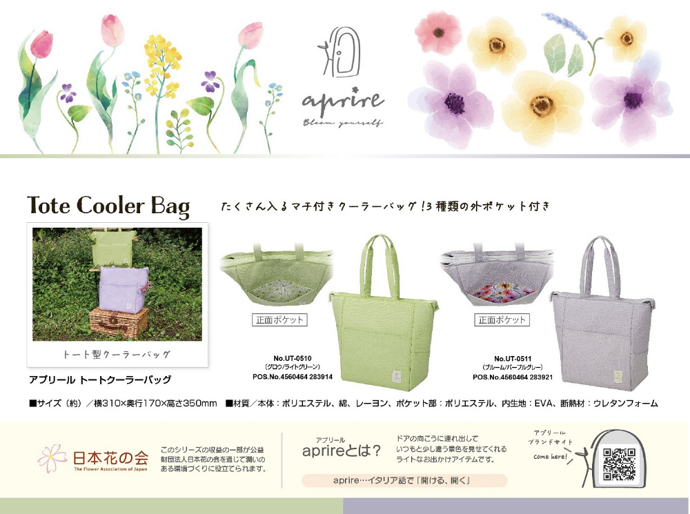 たくさん入るマチ付きクーラーバッグ。正面と左右に3種類のポケット付き。正面ポケットに花柄デザイン。本製品をお買い上げいただくと、その収益の一部が公益財団法人日本花の会を通じて潤いのある環境づくりに役立てられます。