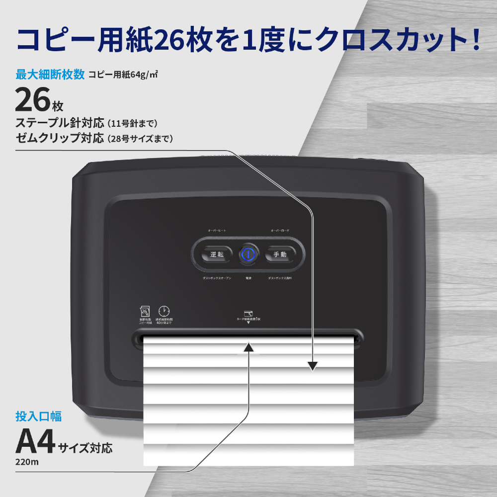 最大細断枚数26枚 クロスカット4x35mm 銀行カード細断対応 連続運転約40分 ノイズレベル55dB
