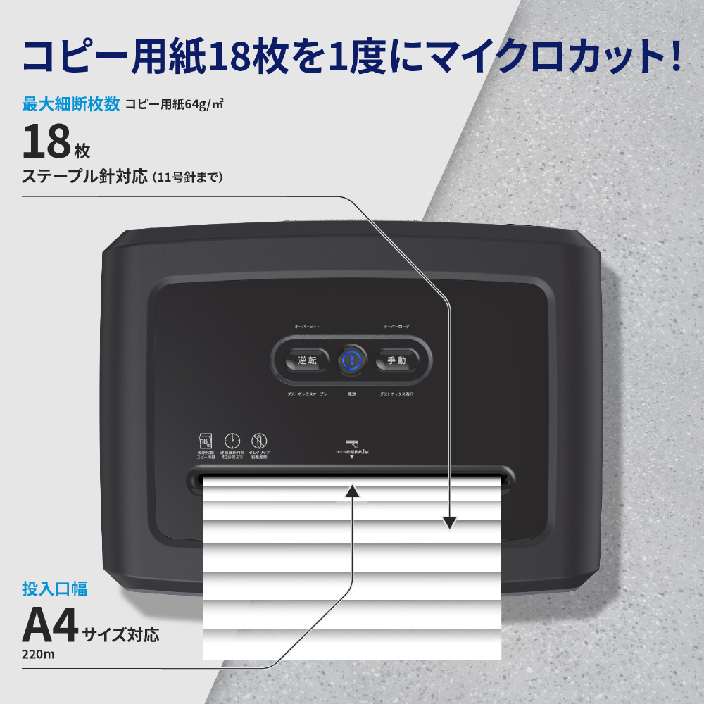 最大細断枚数18枚 マイクロカット2x15mm、銀行カード細断対応 連続運転約40分 ノイズレベル55dB