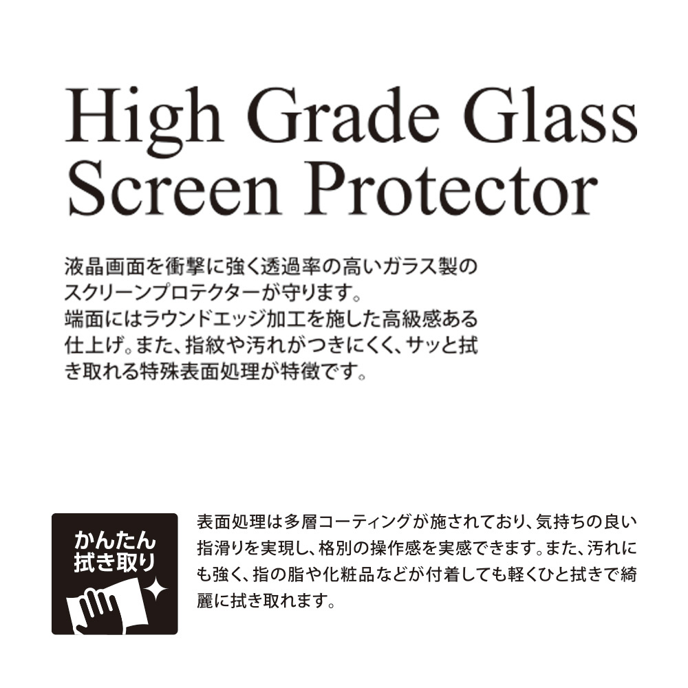 衝撃に強く透過率が高いガラス製スクリーンプロテクターです。端面にラウンドエッジ加工を施し高級感ある仕上がりになっています。また特殊表面処理により、指紋や汚れがつきにくくサッと拭き取ることができます。
