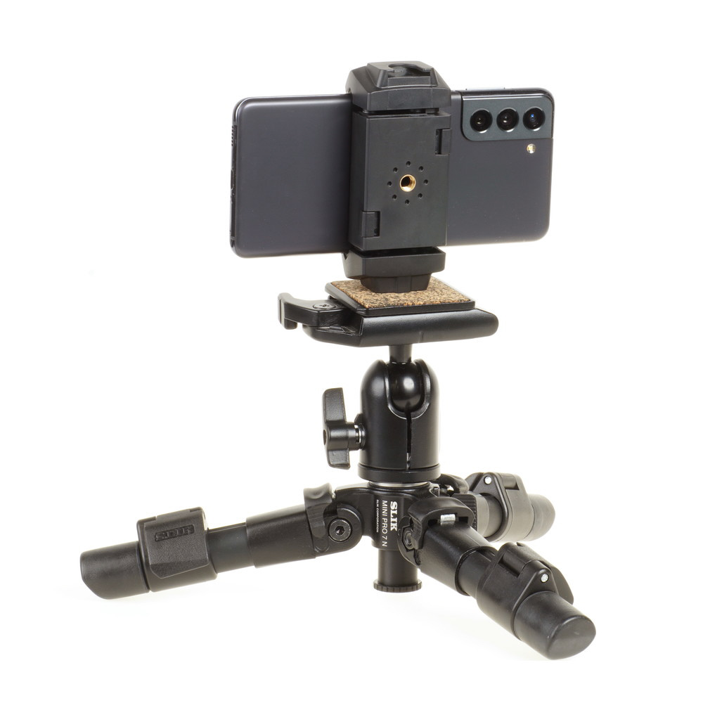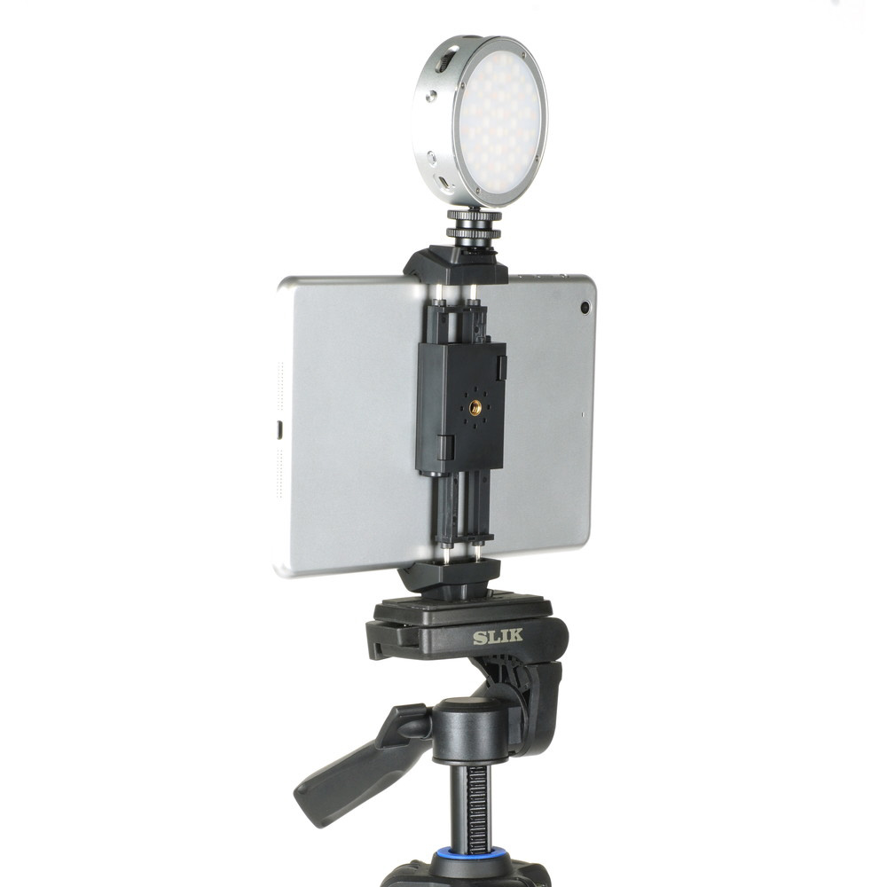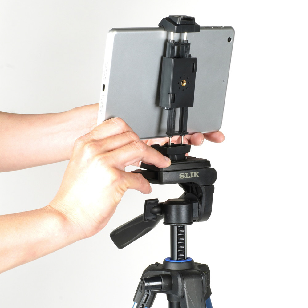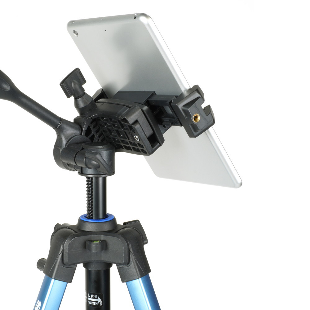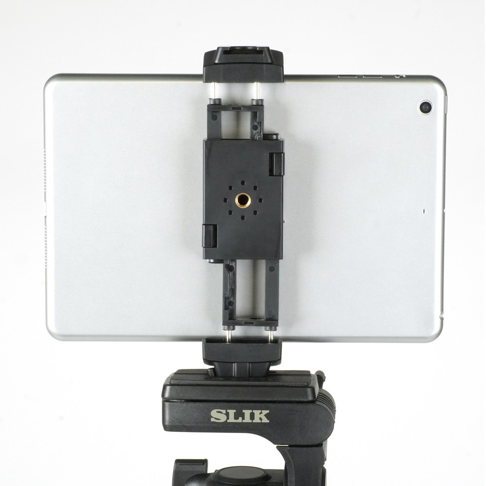 一つのホルダーで、スマホもタブレットも対応できる、三脚への取付ホルダーです。
