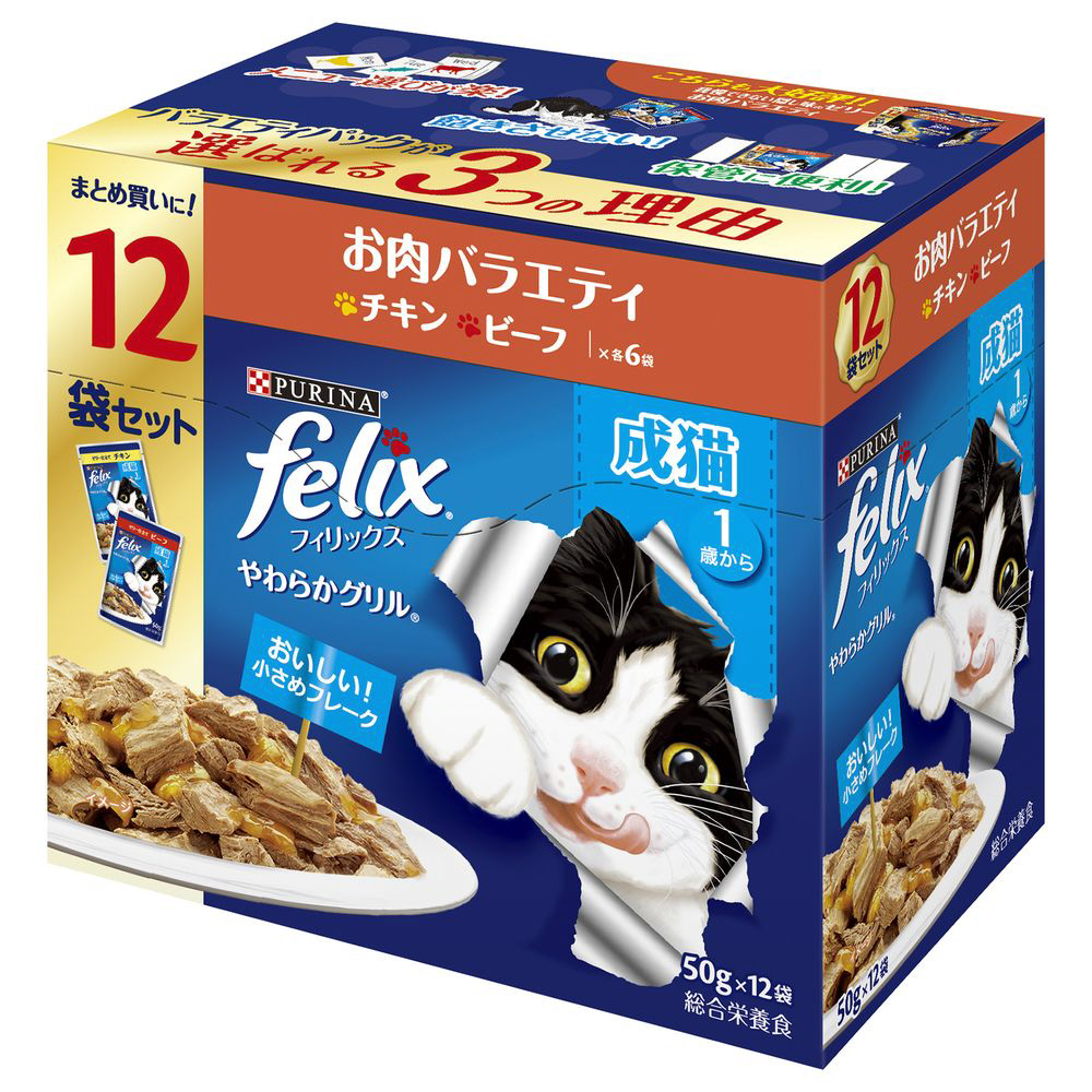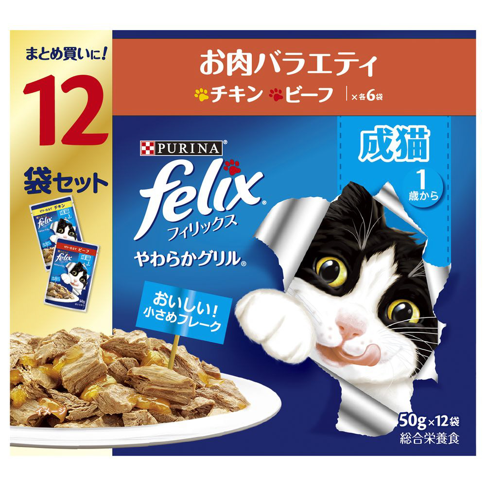 | 商品名 | felix(フィリックス)やわらかグリル 成猫 お肉バラエティ 50g×12袋入 |