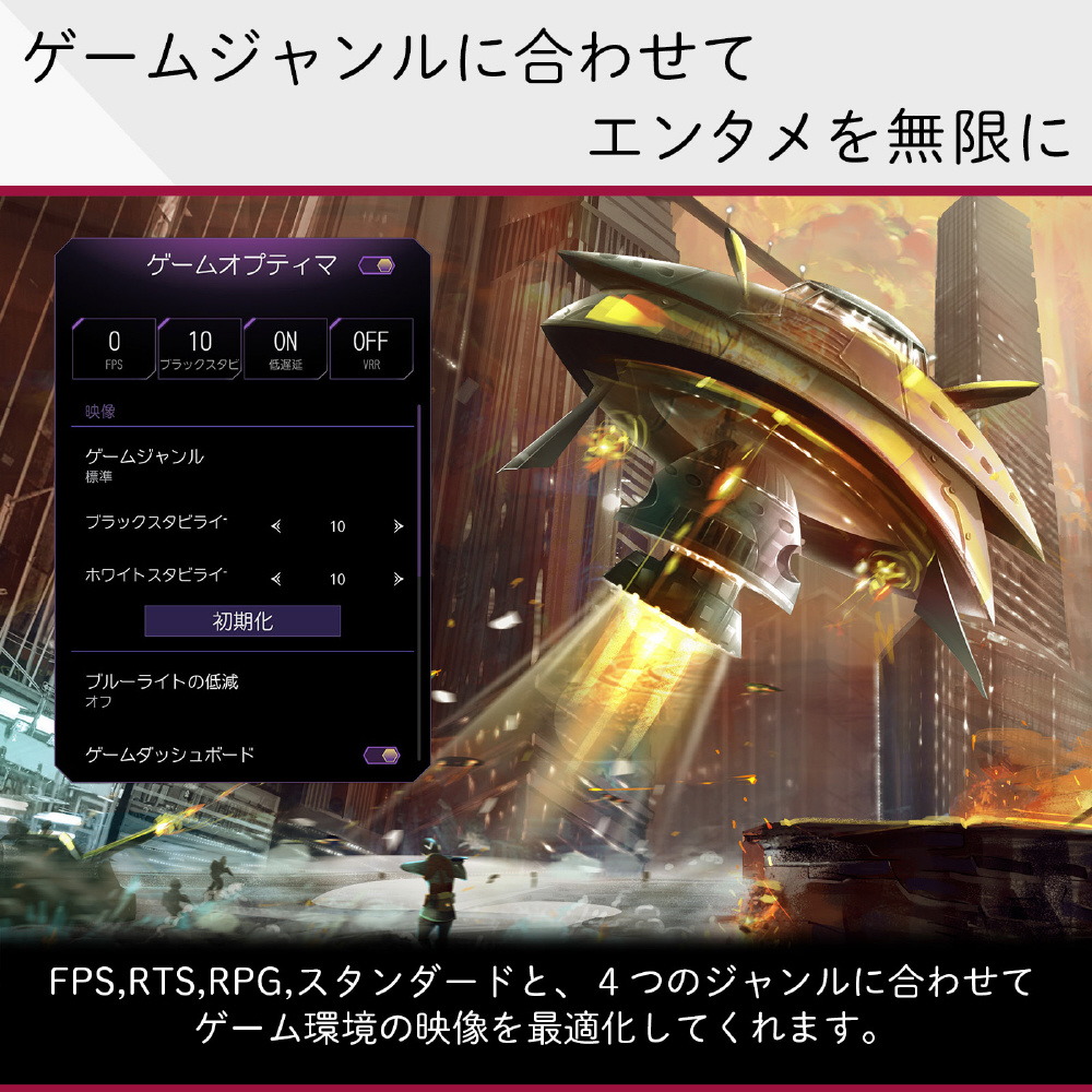 ゲームジャンルに合わせて映像とサウンドを最適化。FPS,RTS,RPG,スタンダードと、4つのジャンルに合わせてゲーム環境の映像を最適化してくれます。