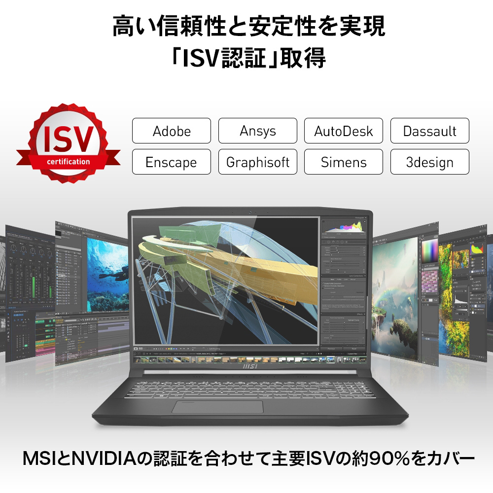 CreatorPro M16 A12Uは、ハイブリッドコアアーキテクチャを採用したCPU「第12世代インテル Core プロセッサー」とプロフェッショナル向けGPU「NVIDIA RTX Laptop GPU」を搭載したパワフルなモバイルワークステーションです。液晶パネルにアスペクト比16:10の「Golden Ratio ディスプレイ」を採用することで一般的なフルHDパネルよりも広い作業領域を確保して作業効率を向上させた新しいシリーズの誕生です。