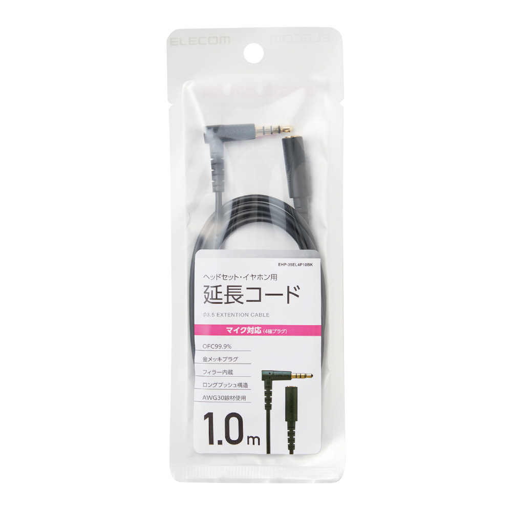 1m イヤホン ヘッドホン 延長コード φ3.5mm 4極 ステレオ ミニジャック to ミニプラグ L字プラグ マイク対応 ブラック EHP-35EL4P10BK