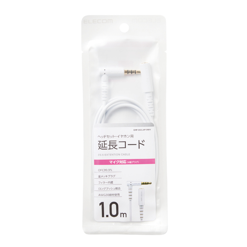 1m イヤホン ヘッドホン 延長コード φ3.5mm 4極 ステレオ ミニジャック to ミニプラグ L字プラグ マイク対応 ホワイト EHP-35EL4P10WH