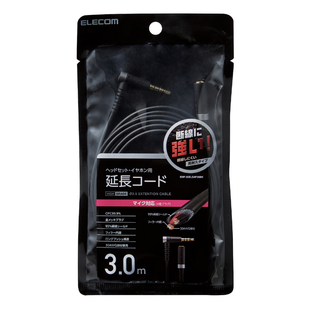 3m イヤホン ヘッドホン 延長コード φ3.5mm 4極 ステレオ ミニジャック to ミニプラグ 高耐久 L字プラグ マイク対応 ブラック EHP-35ELS4P30BK 【864】