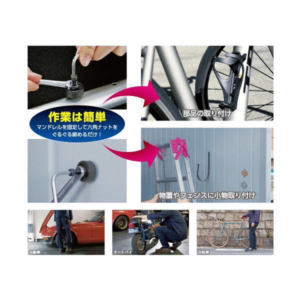 ●裏側に手が回らない自動車パネル(薄板)やパイプにナット部(雌ネジ)が簡単に素早く作れるキットです