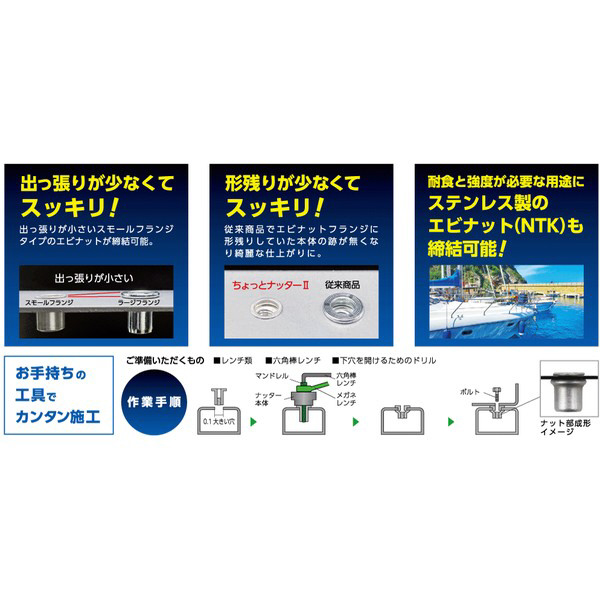 ●全材質(アルミ・スチール・ステンレス)のエビナットに使用ができます。また他メーカーのかしめナットも使用可能です