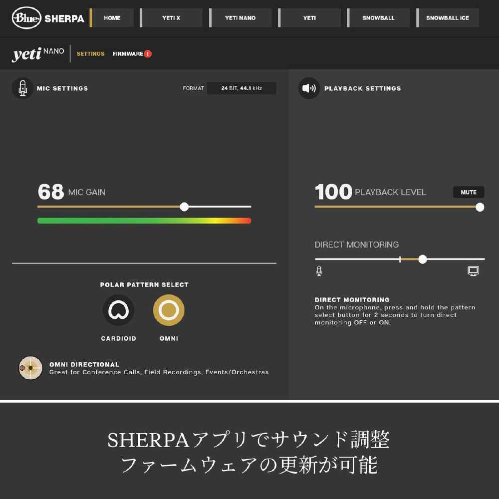 マイクゲイン、ヘッドフォンのボリューム、モニタリングの設定、ピックアップパターンの選択をPC(Windows、Mac)から細かくコントロールし、Yeti Nanoを適切にチューニングできます。