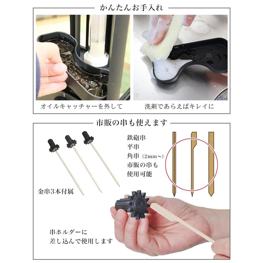 | 丸洗い可能パーツ | オイルキャッチャー、串、串ホルダー |