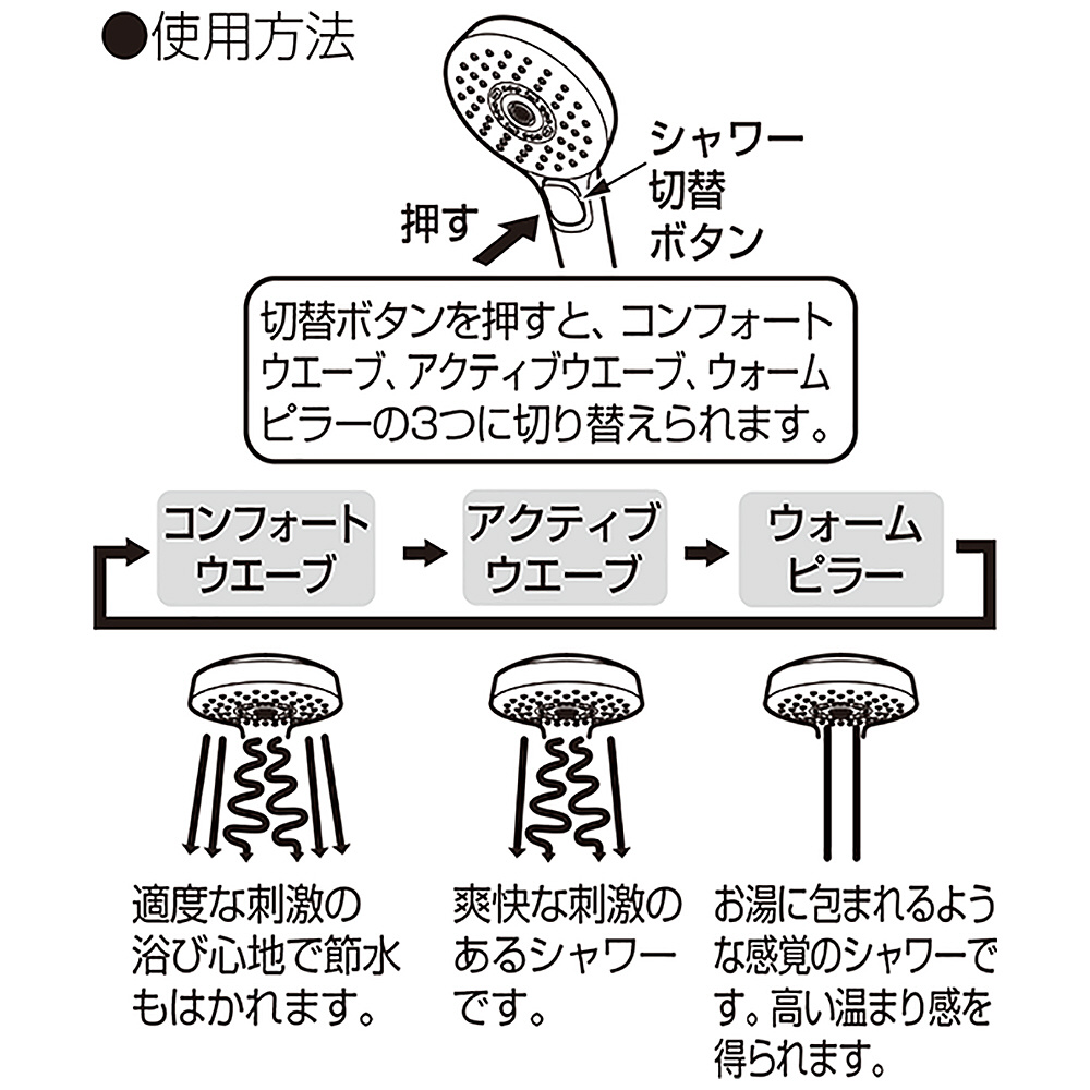 1つのシャワーヘッドで「コンフォートウェーブ」、「ウォームピラー」、「アクティブウェーブ」の3つの浴び心地を体感いただけます。