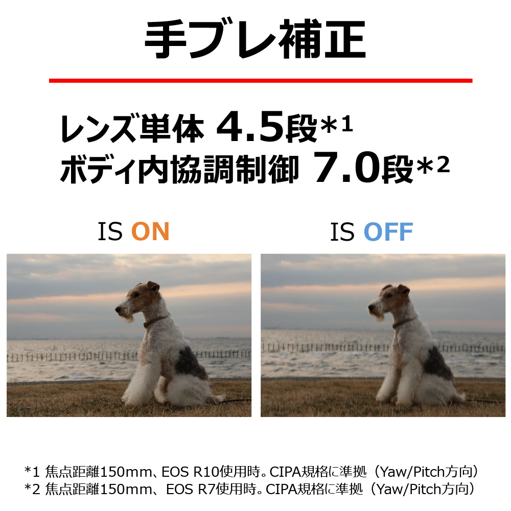 ※2 焦点距離 150mm(35mm判換算240mm相当)、EOS R7使用時。CIPA規格に準拠(Yaw/Pitch方向)。