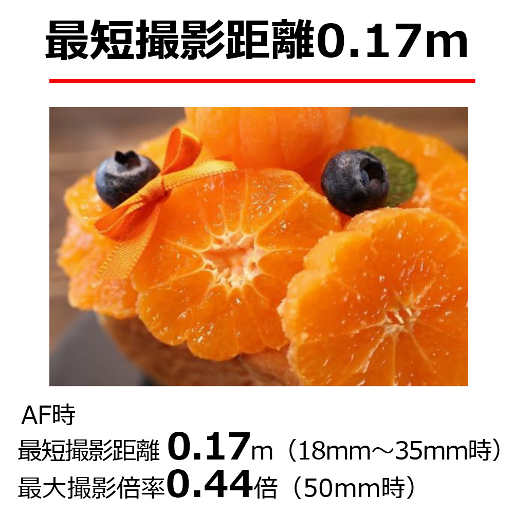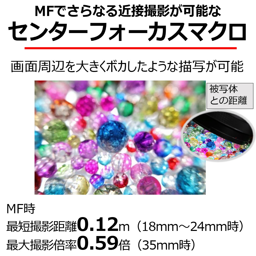 ※ 最短撮影距離0.12mは焦点距離18-24mm時。最大撮影倍率0.59倍は焦点距離35mm時。
