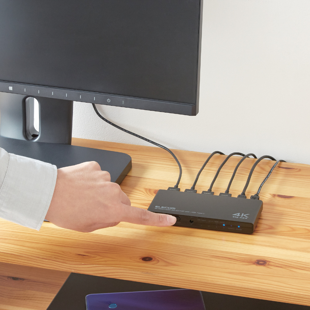 4K60Hz(18Gbps)、HDCP2.2対応により4KモデルのHDMIポート不足を解消できる4ポートHDMI切替器です。 USB Type-C入力ポート搭載で、パソコン・タブレット・スマートフォン等のUSB Type-C出力機器も接続できます。 付属の専用ACアダプターにより安定した動作を実現、また付属のリモコンにより離れた場所からの入力切替操作が可能です。 放熱効率の良いメタル筐体を採用、また完全手動切替で思わぬ誤作動を防げます。