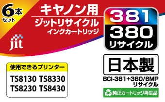 互換リサイクルインクカートリッジ [キヤノン BCI-381+380/6MP](標準容量) 6色パック JIT-C3803816P