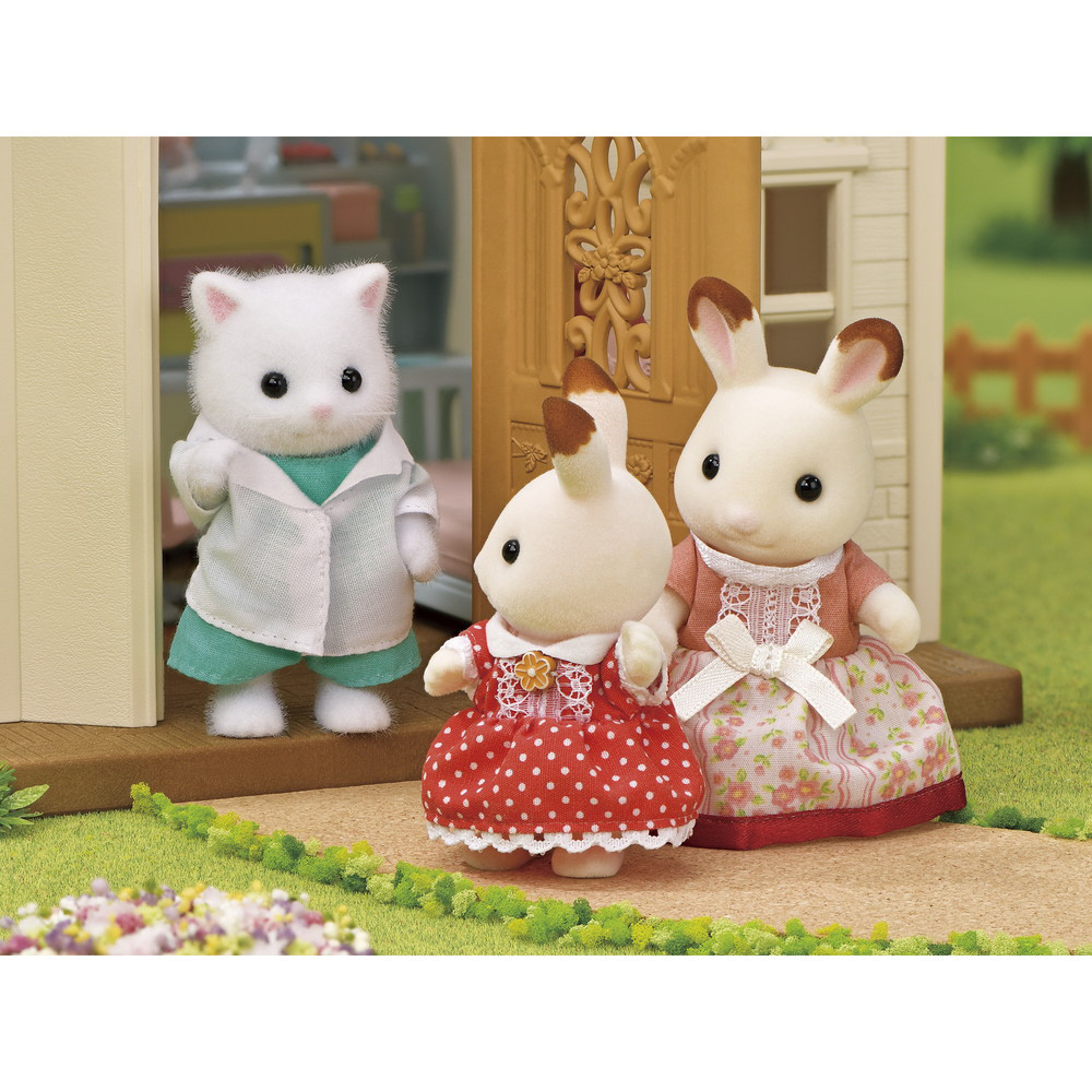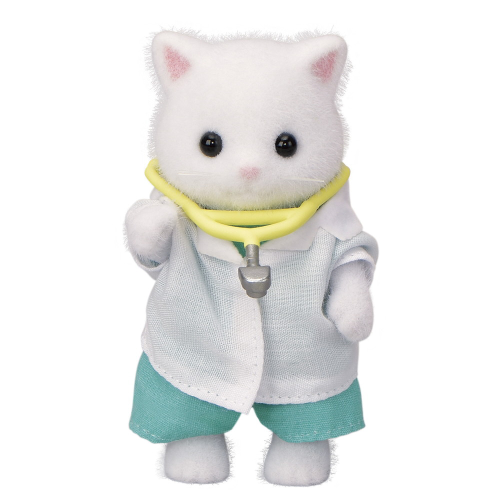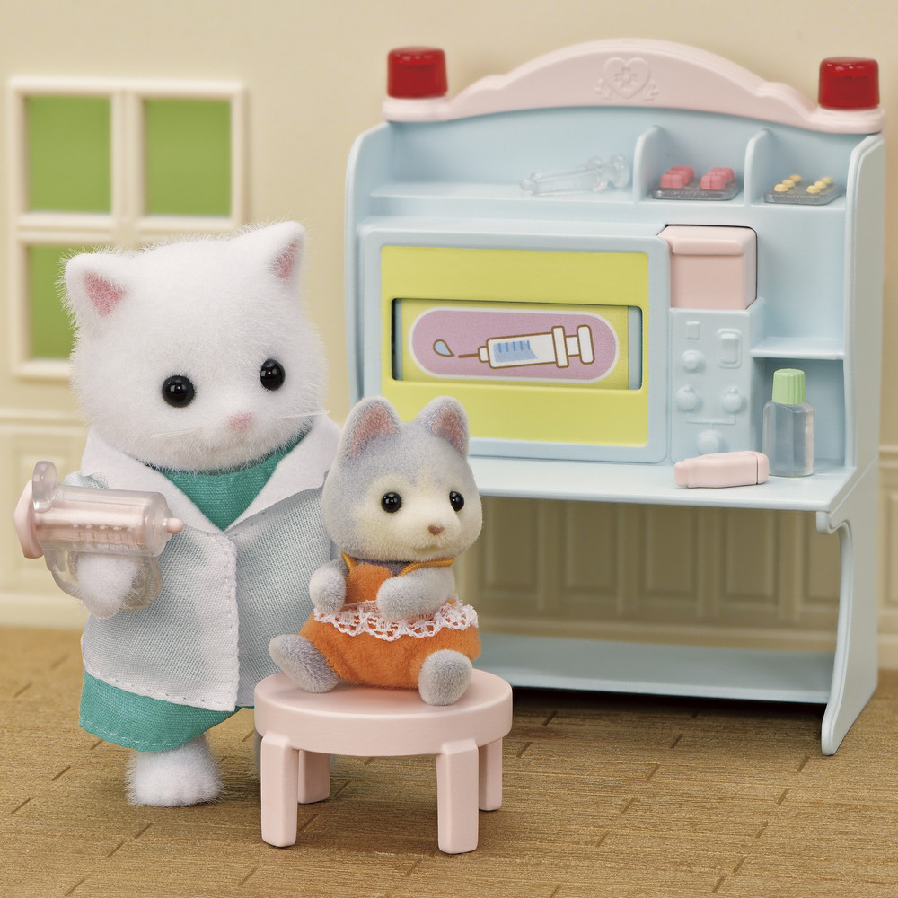 白衣を着たお医者さん人形(ペルシャネコのお母さん)、診断結果が分かるしんさつ机などがついた、お医者さんごっこが楽しめるセットです。