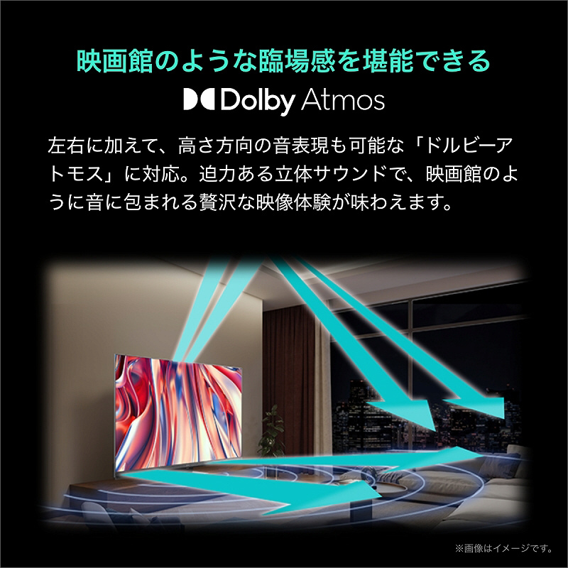 左右に加えて、高さ方向の音表現も可能な「ドルビーアトモス」に対応。迫力ある立体サウンドで、映画館のように音に包まれる贅沢な映像、音場体験が味わえます。
