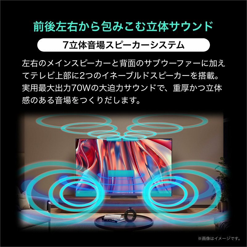 左右にメインスピーカーとツイーター、背面のサブウーファーに加えてテレビ上部に2つのイネーブルドスピーカーを搭載。実用最大出力70Wの大迫力サウンドで、重厚かつ立体感のある音場をつくりだします。