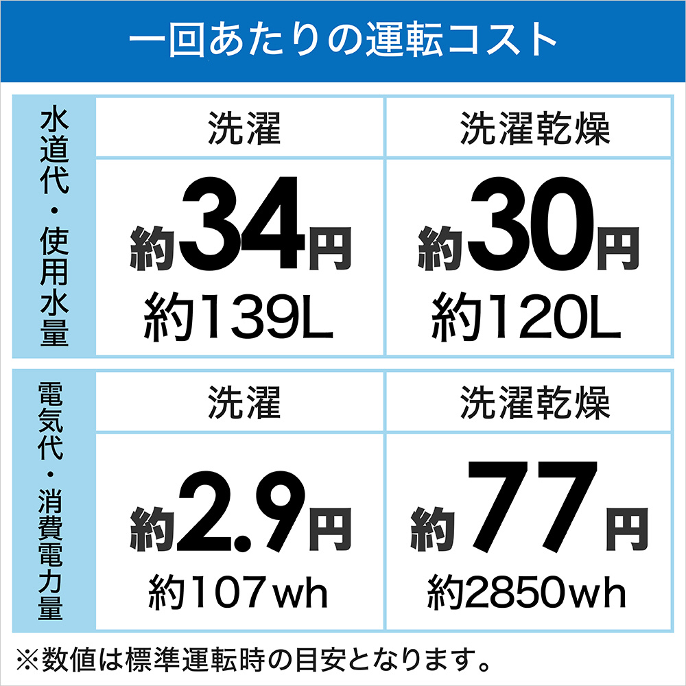 | 消費電力量 | 洗濯時 約107Wh 洗濯~乾燥時 約2850Wh |