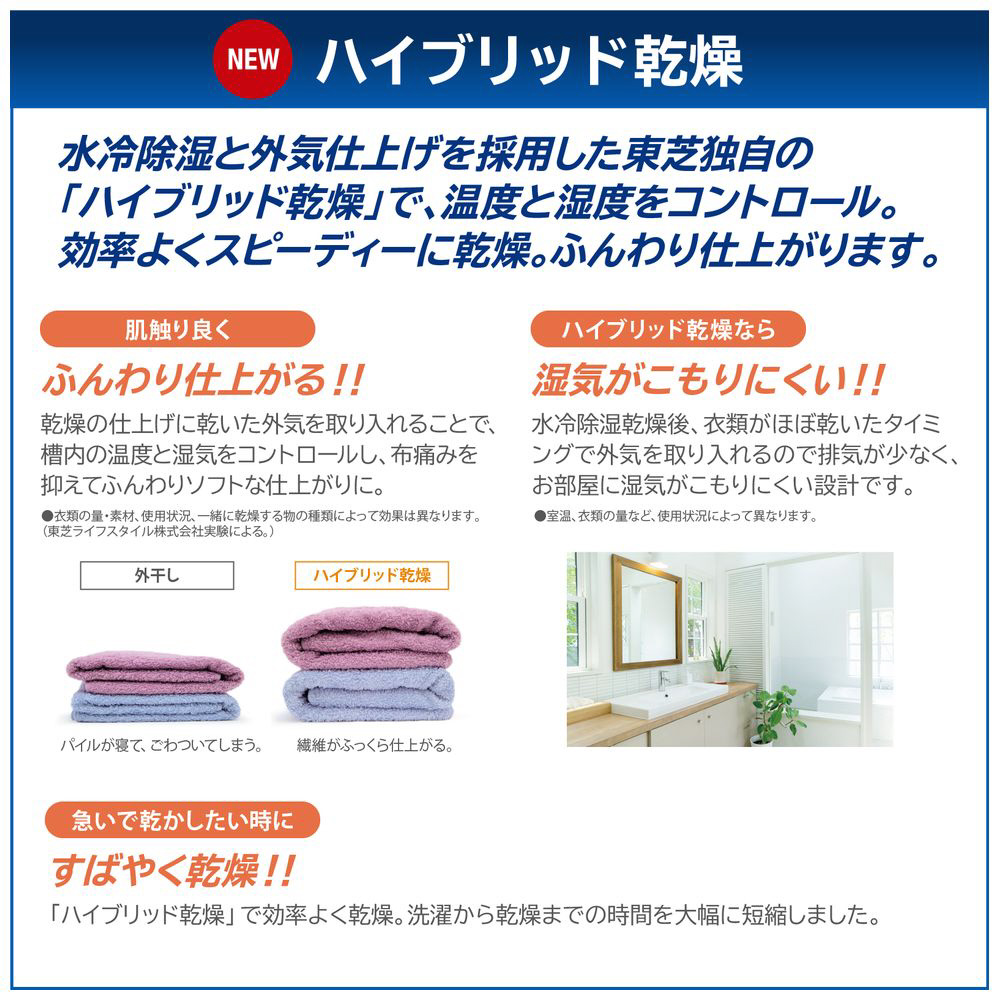 ●衣類の量・素材、使用状況、一緒に乾燥する物の種類によって効果は異なります。(当社実験による。)