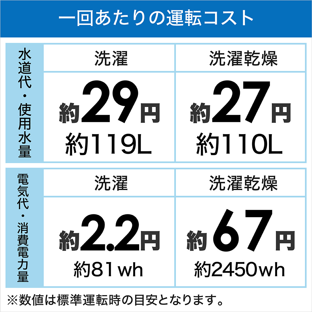 消費電力量 洗濯時 約81Wh 洗濯~乾燥時 約2450Wh