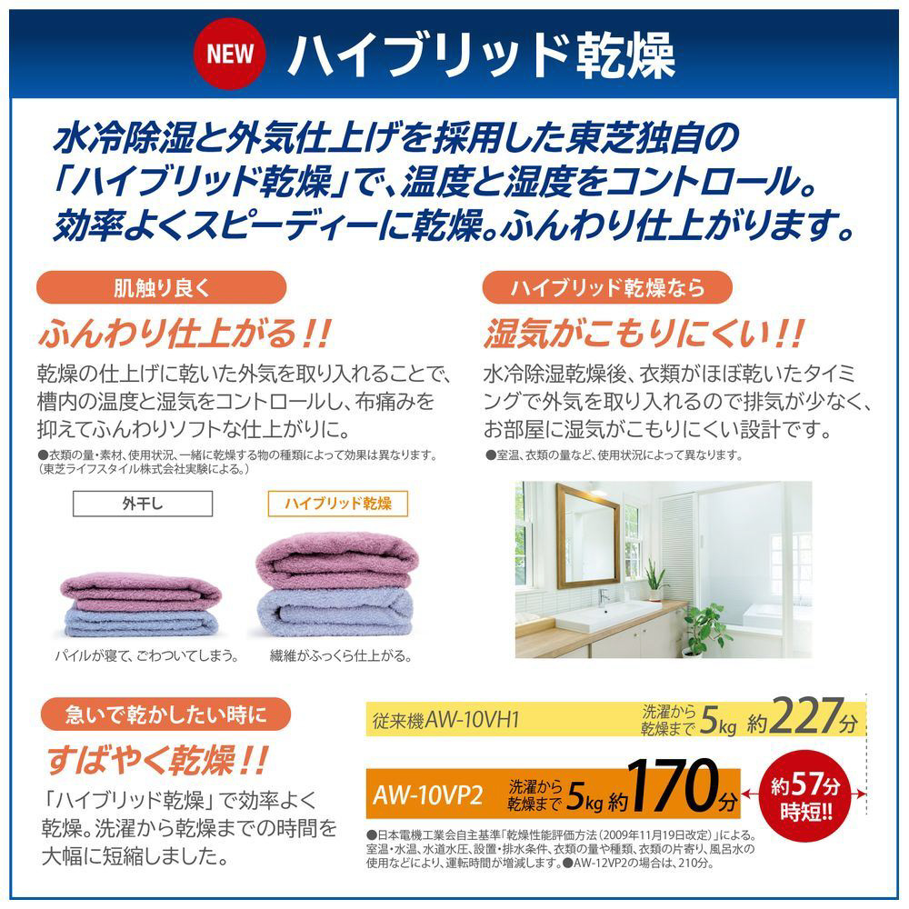 東芝の縦型洗濯機AW-10VP2-Tは抗菌ウルトラファインバブル洗浄W搭載したモデル。普段通りのお洗濯で、黄ばみや臭いを抑える。